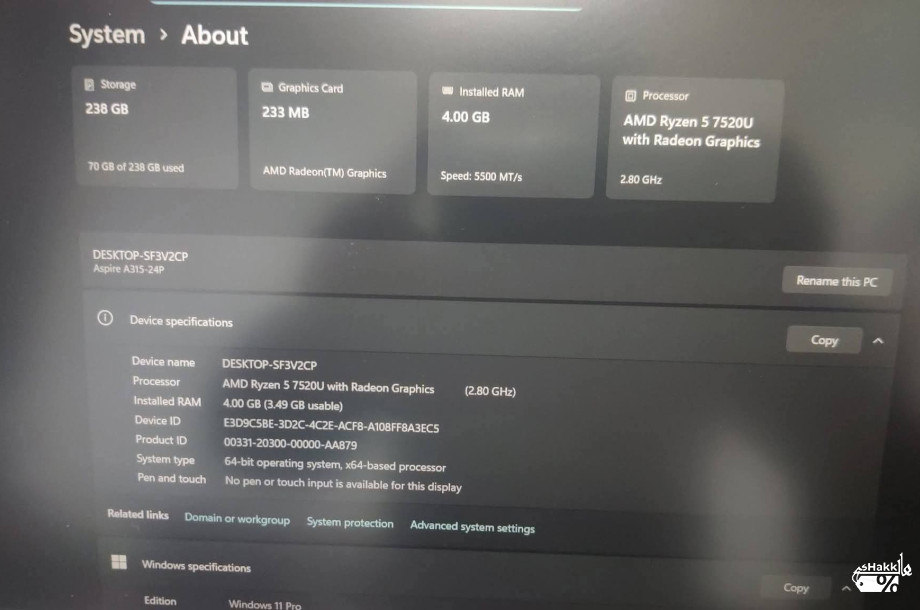 AMD Ryzen 5 7520U Processor ( 8MB Cache, 2.8up to 4.3 GHz) RAM: 4GB DDR5 - SSD: 256GB, Graphic : Intel UHD Graphic Screen Size: 15.6-inch ( FHD 1920 x 1080 ), TN ROM: NAN Others: WiFi, Bluetooth, Camera,Multi Card Slot . ويندوز 11 اصلي مايكروسوفت اوفيس اصلي
